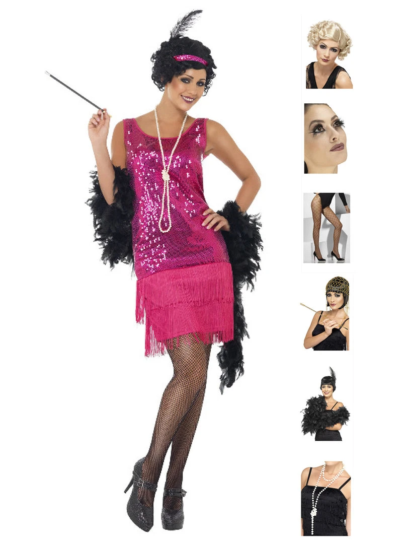 This 1920s inspired fancy dress outfit includes a dress, headpiece and necklace.