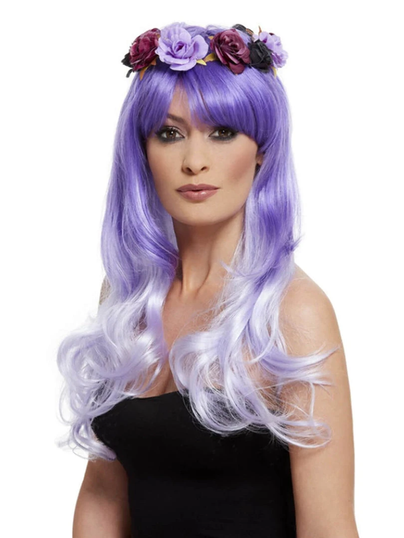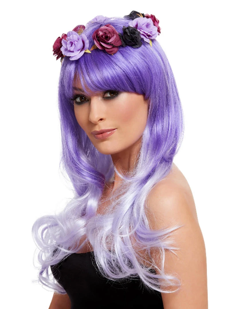 Deluxe Day of the Dead Glam Wig, Purple with Flowers