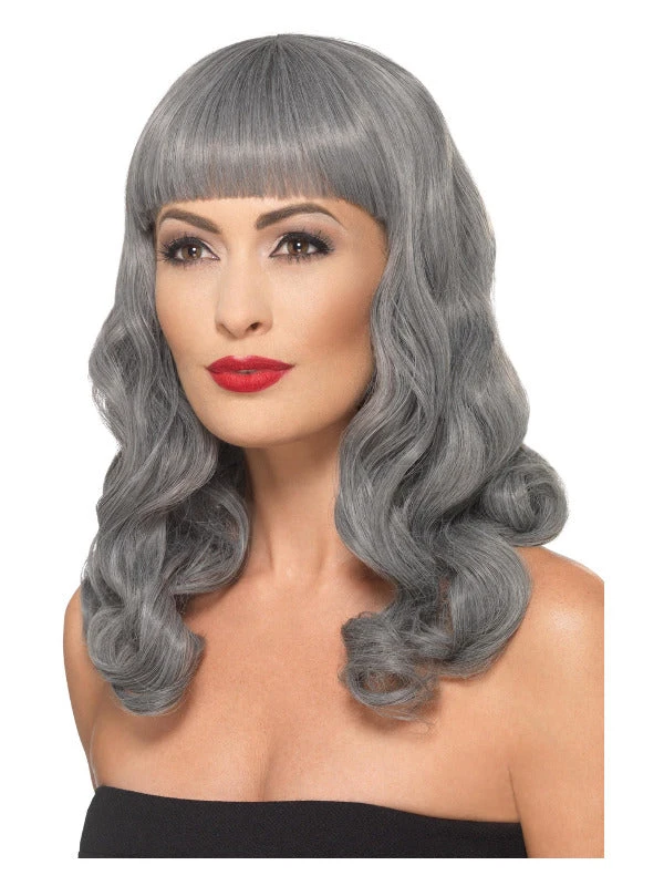 Dress up your look with this deluxe wavy dark grey wig with fringe. Wig is both head resistant and styleable.