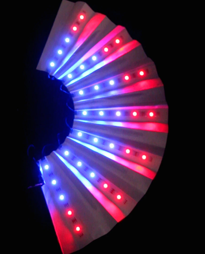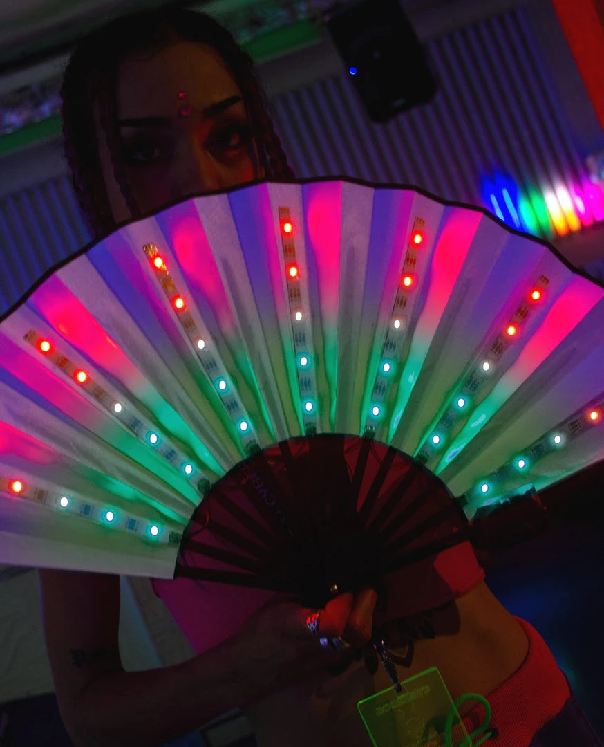 Be the centre of attention! This Cyberdog light up fan is perfect for ravers, festival-goers and performers! Features colour-changing lights with strobing patterns, flashing or solid colours, all selectable from the supplied remote control. Rechargeable via USB and lasts several hours!