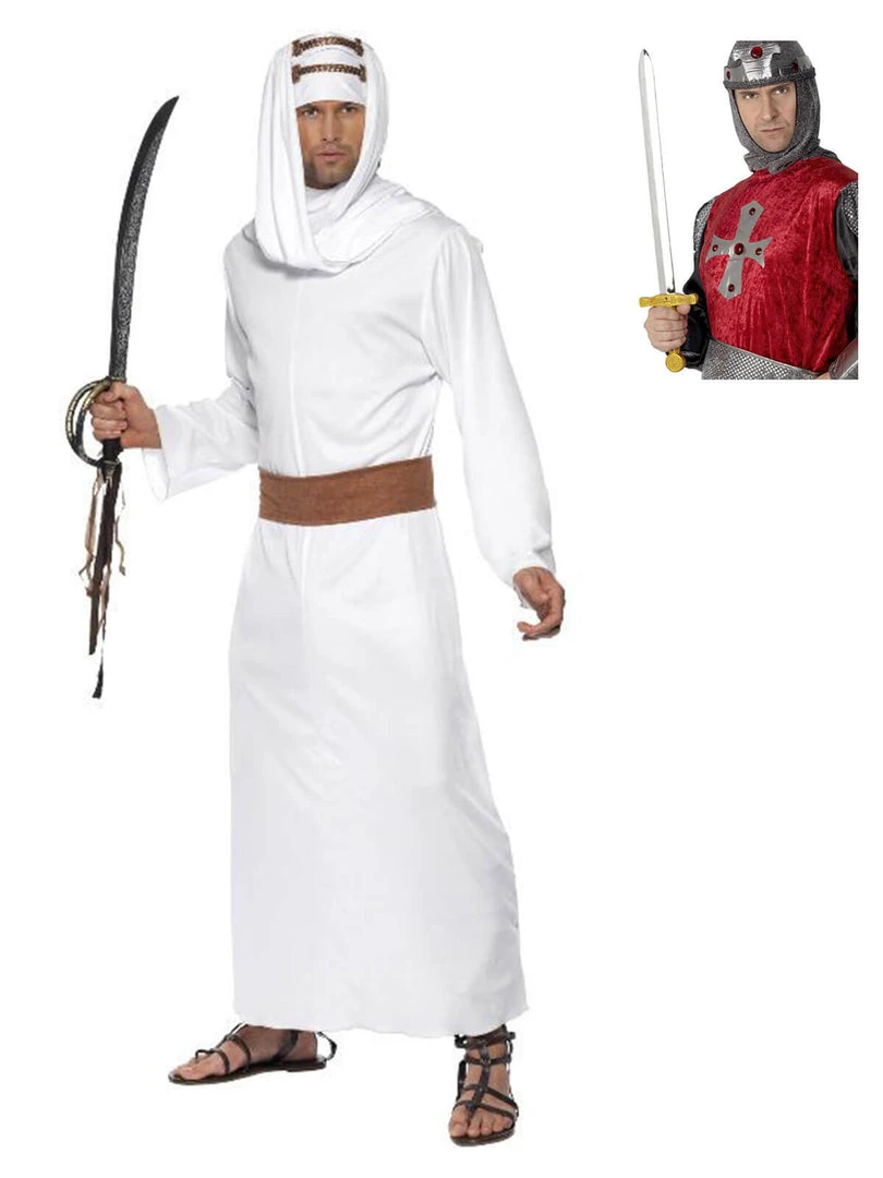 This realistic Lawrence of Arabia Costume consists of a long white hooded gown, headpiece and belt. Complete your look with a Sword and Gladiator Sandals. Camel not included!