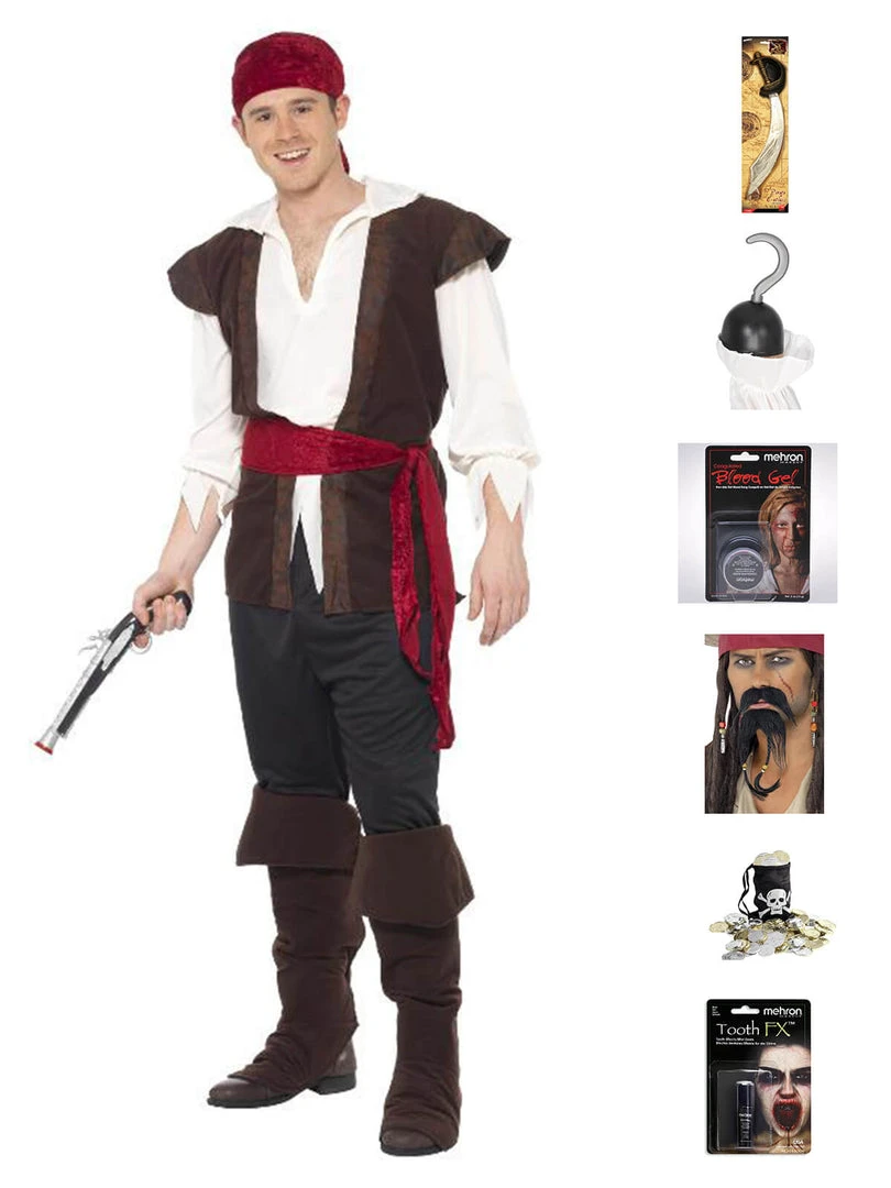 Shiver me timbers! Walk the plank in true perilous style in this Pirate Costume. This fancy dress costume includes a headscarf, shirt, waistcoat, trousers, belt and bootcovers. Complete the look with an eyepatch, hook and some SFX to create that pirate look. Aye Aye Captain!