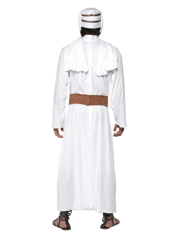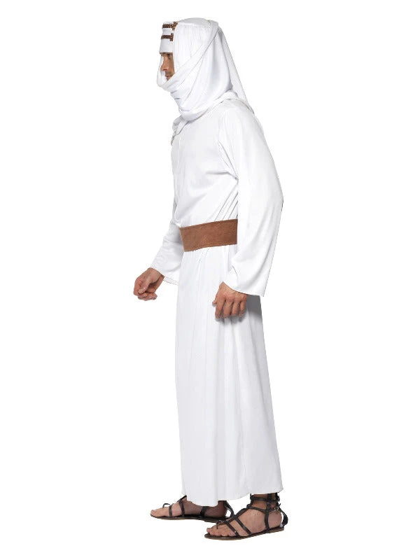 This realistic Lawrence of Arabia Costume consists of a long white hooded gown, headpiece and belt. Complete your look with a Sword and Gladiator Sandals. Camel not included!