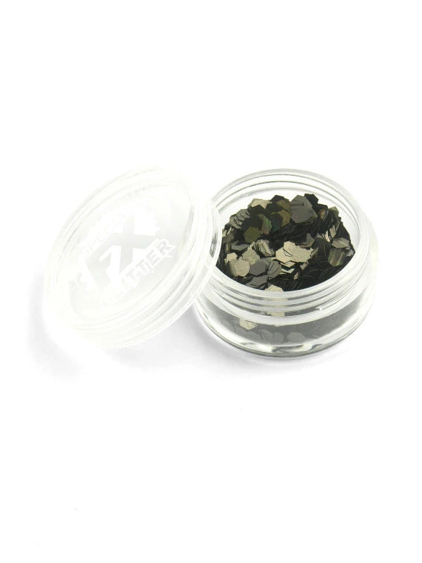 This large Black confetti glitter is so versatile for many looks. Stick to skin with any skin adhesive for an avant garde look.