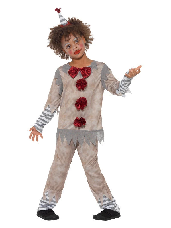 Bring out the old or the evil in this vintage Clown boy costume. Comes complete with grey and red top, trousers & headband.